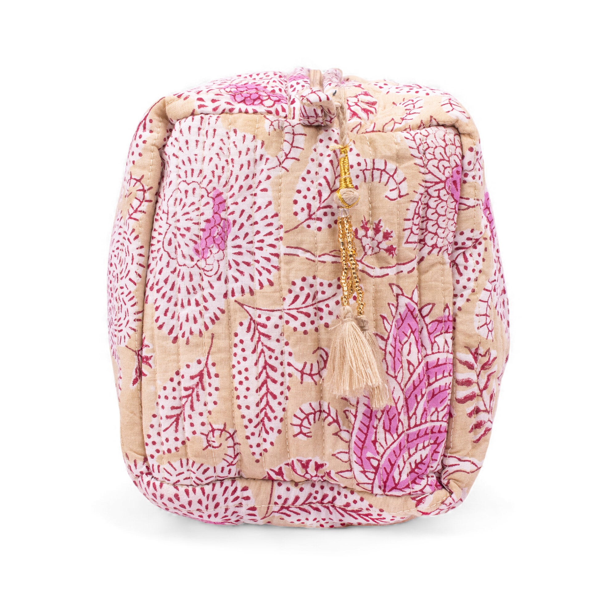 Toilettas - zandkleur met roze/lila bloemen - Large