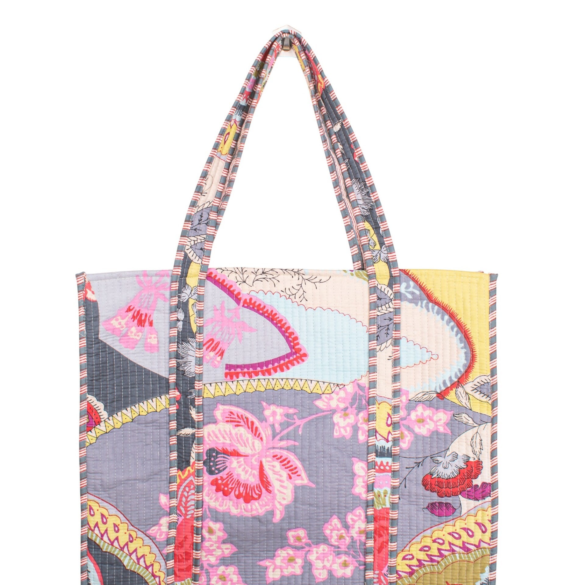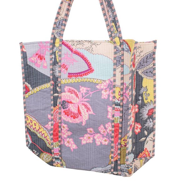 De tas is gemaakt van een stevige katoenen stof en heeft een vrolijk patroon met bloemen en bladeren op een grijs/blauwe achtergrond.