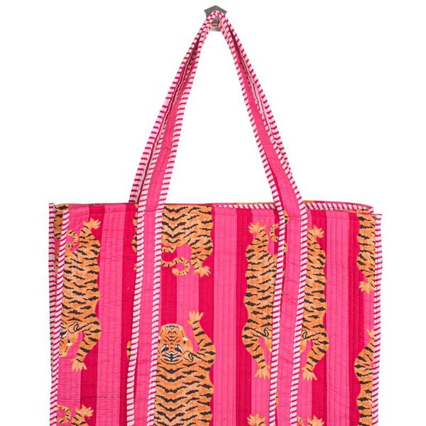 De tas is gemaakt van een stevige katoenen stof en heeft een vrolijk patroon met tijgers.
