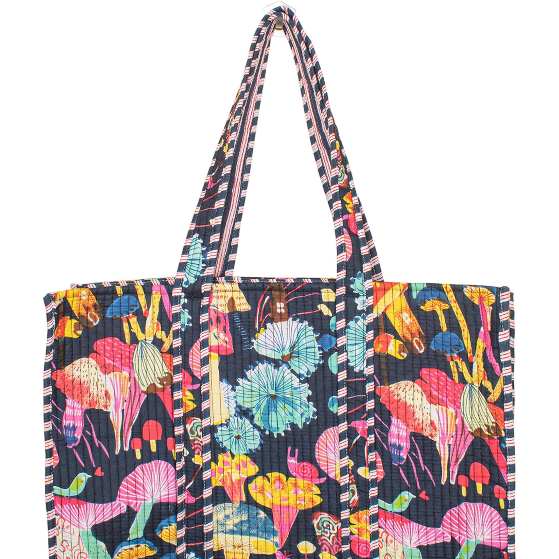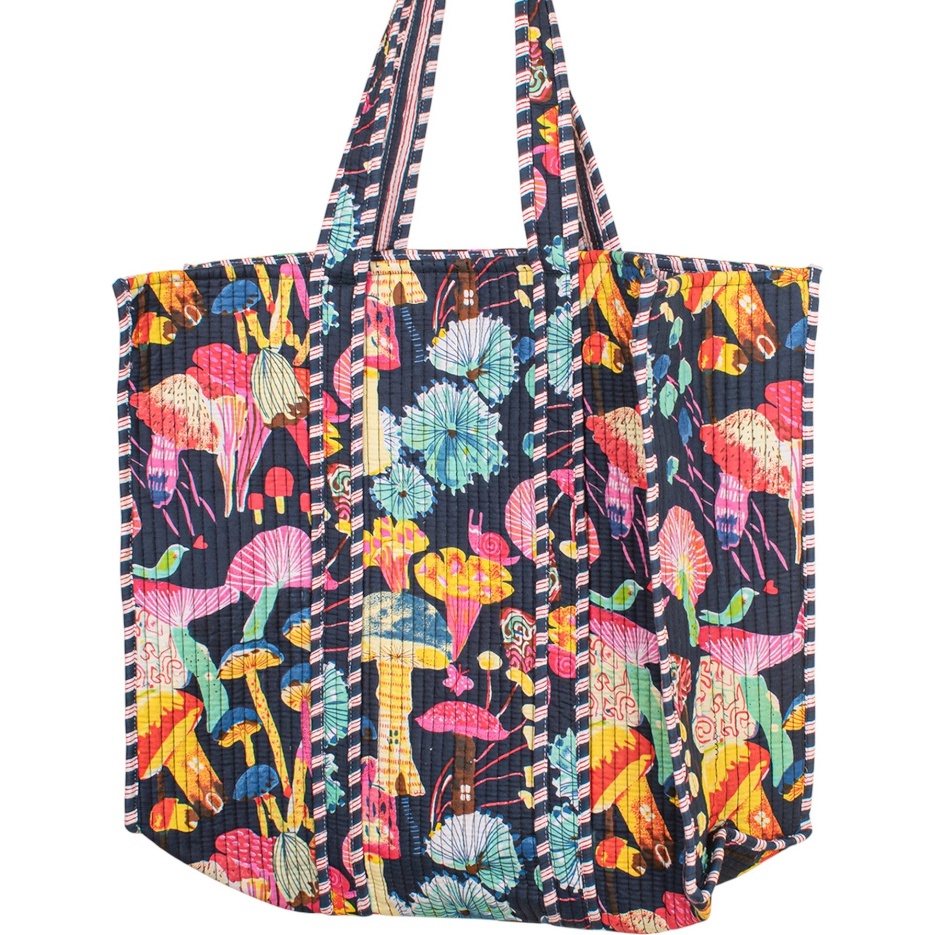 De tas is gemaakt van een stevige katoenen stof en heeft een vrolijk patroon met paddenstoelen.