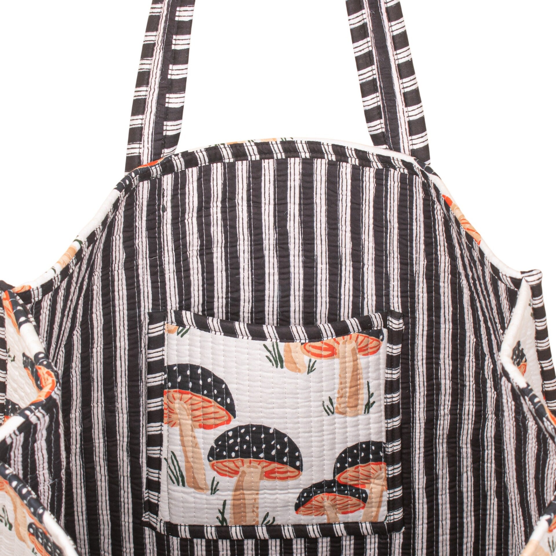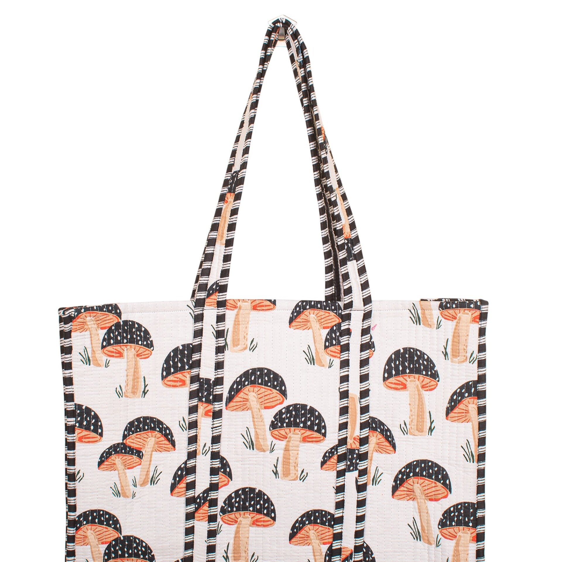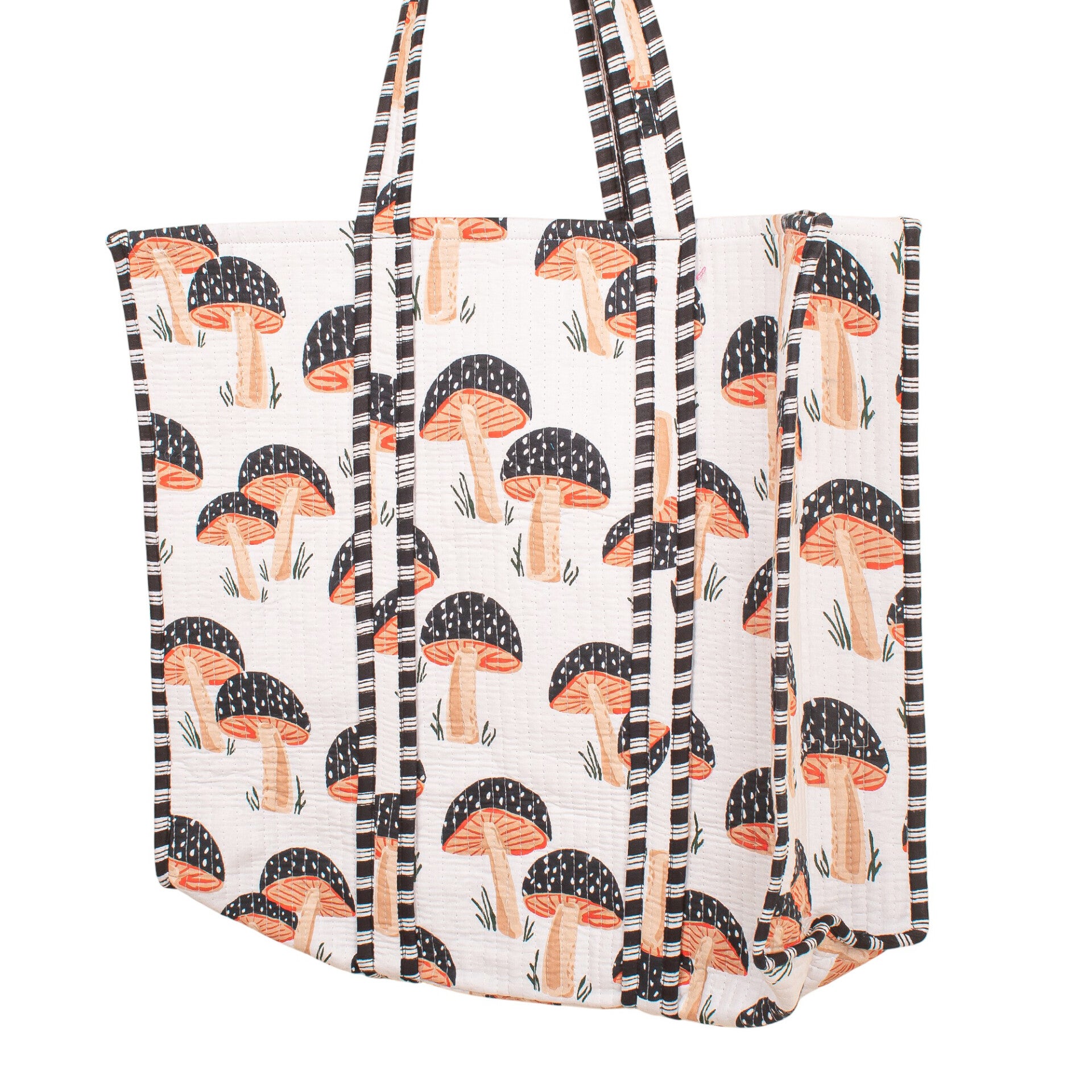 De tas is gemaakt van een stevige katoenen stof en heeft een vrolijk patroon met paddenstoelen.