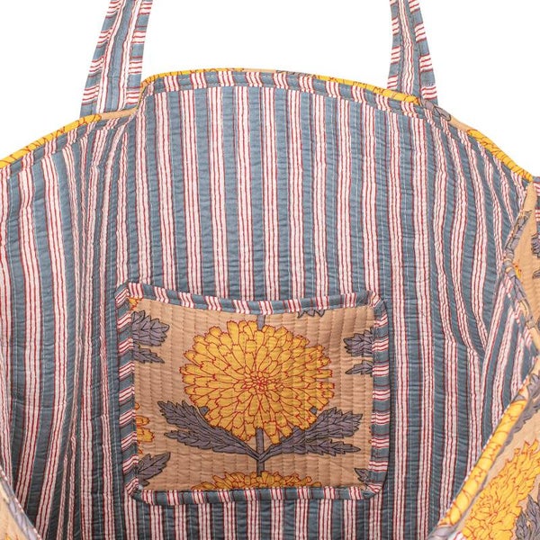 De tas is gemaakt van een stevige katoenen stof en heeft een vrolijk patroon met bloemen.
