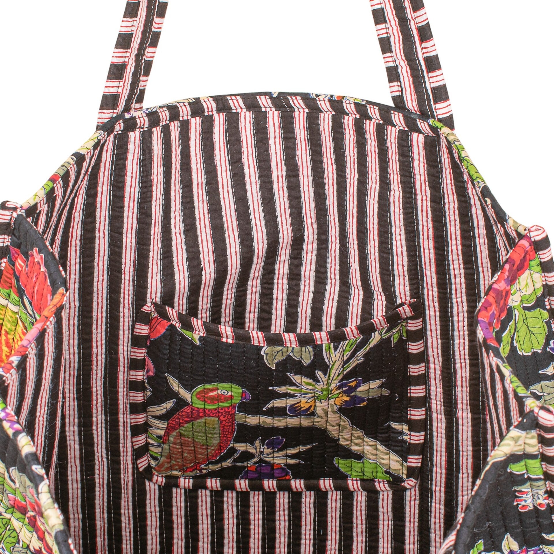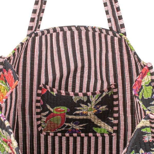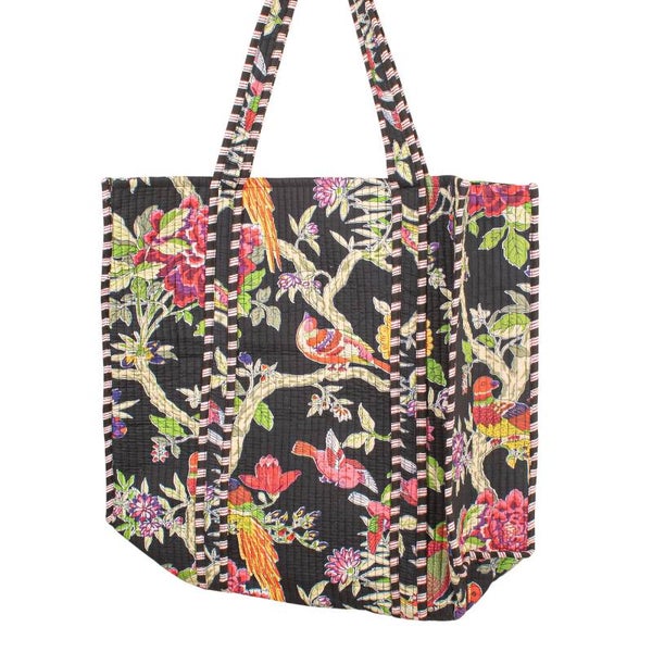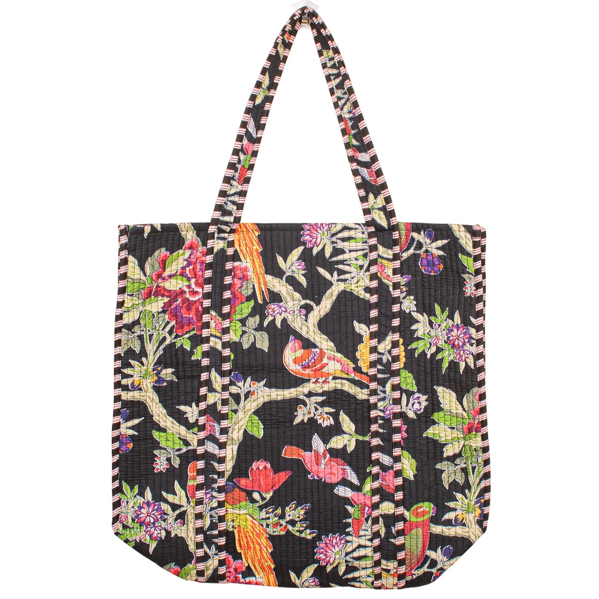 De tas is gemaakt van een stevige katoenen stof en heeft een vrolijk patroon met bloemen en vogels.