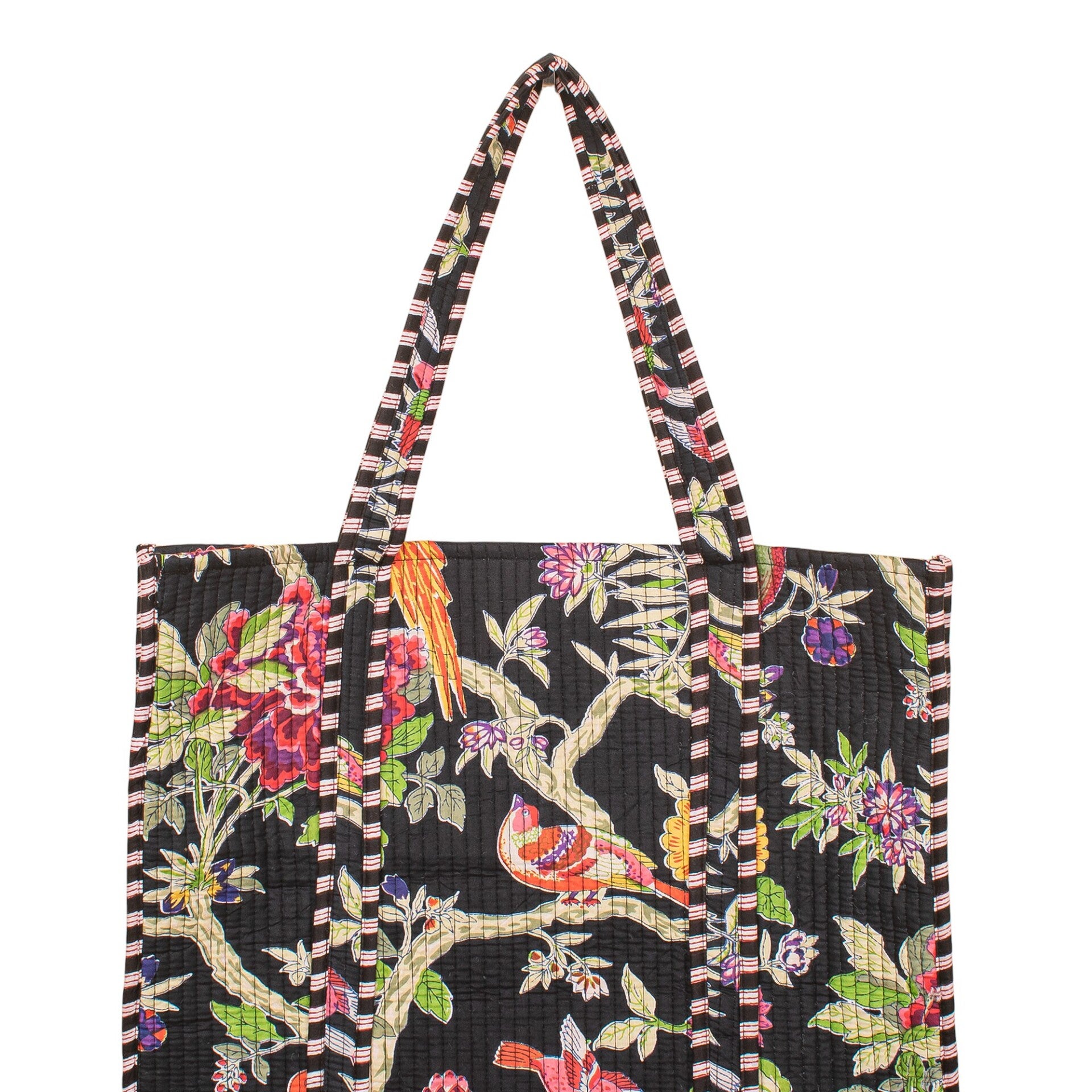 Bohemian schoudertas - Tote Bag - zwart met bloemen en vogels